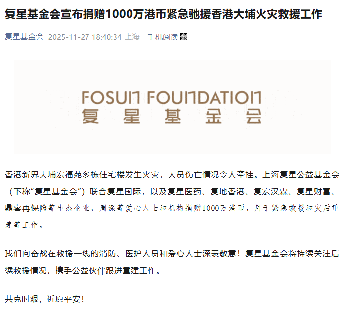 11月26日,香港新界大埔区宏福苑发生火灾,造成重大人员伤亡。灾情牵动全体中国同胞的心,沪上民营企业纷纷伸出援手,驰援香港大埔灾后救援。