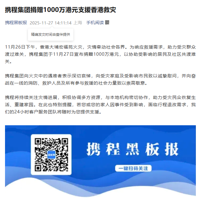 携程集团捐赠1000万港元,以协助受影响的居民和社区共渡难关。