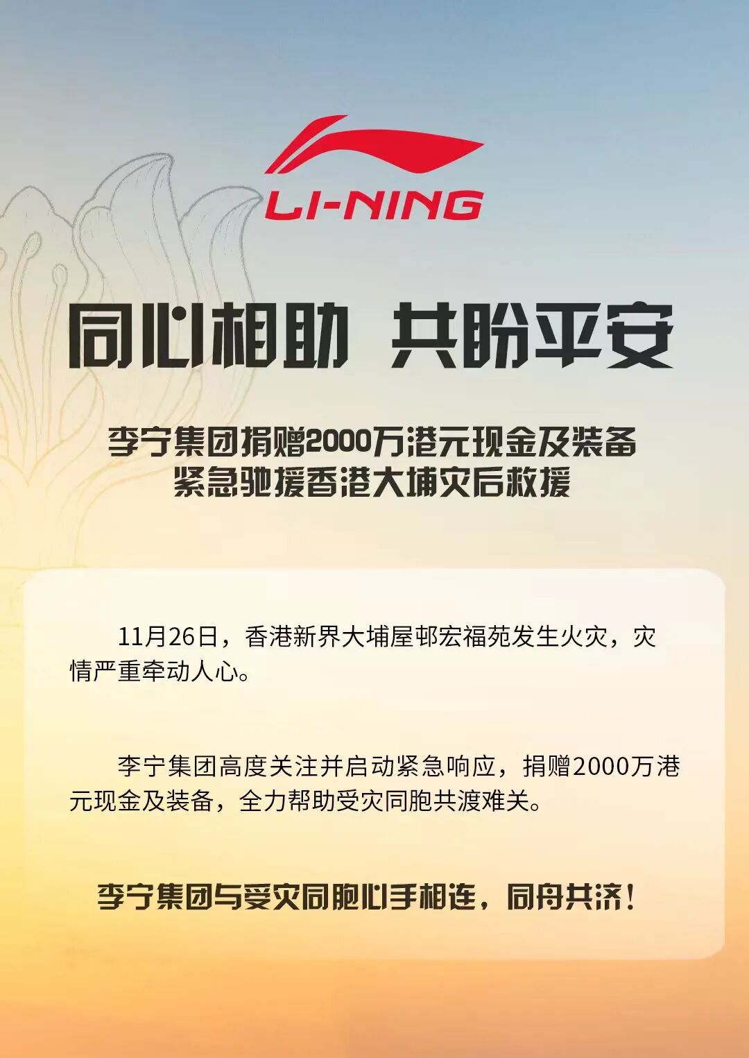 李宁集团捐赠价值2000万港元现金及装备,驰援灾后救援工作。