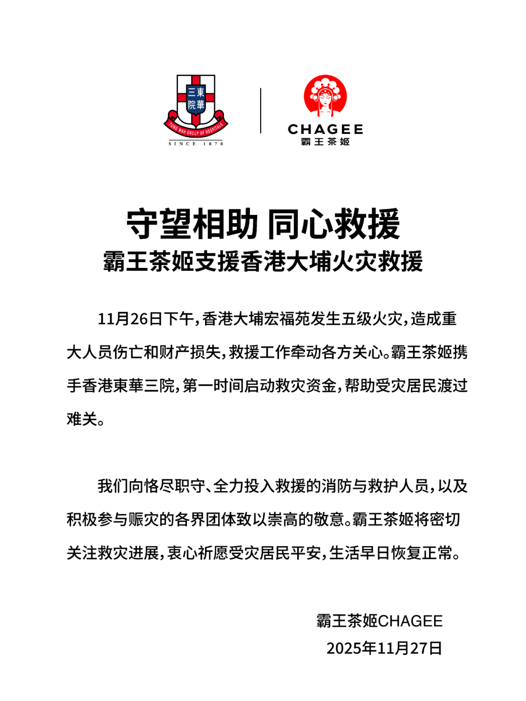 霸王茶姬携手香港东华三院,启动救灾资金,帮助受灾居民渡过难关。