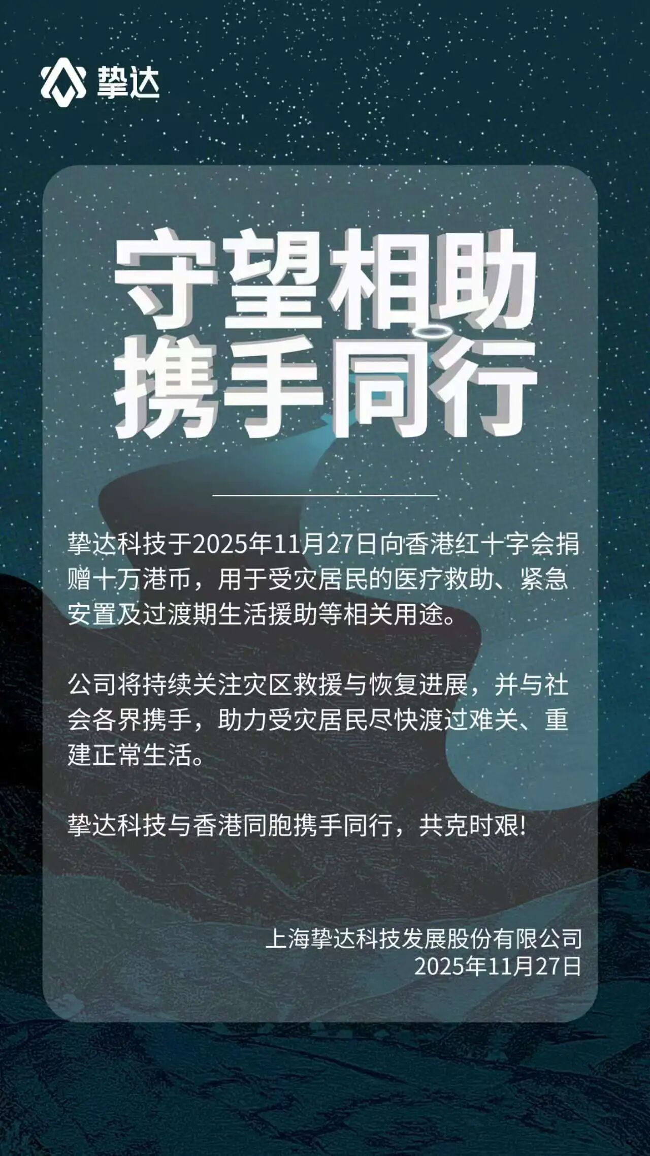 挚达科技向香港红十字会捐赠10万港元,用于受灾居民的医疗救助、紧急安置及过渡期生活援助等相关用途。